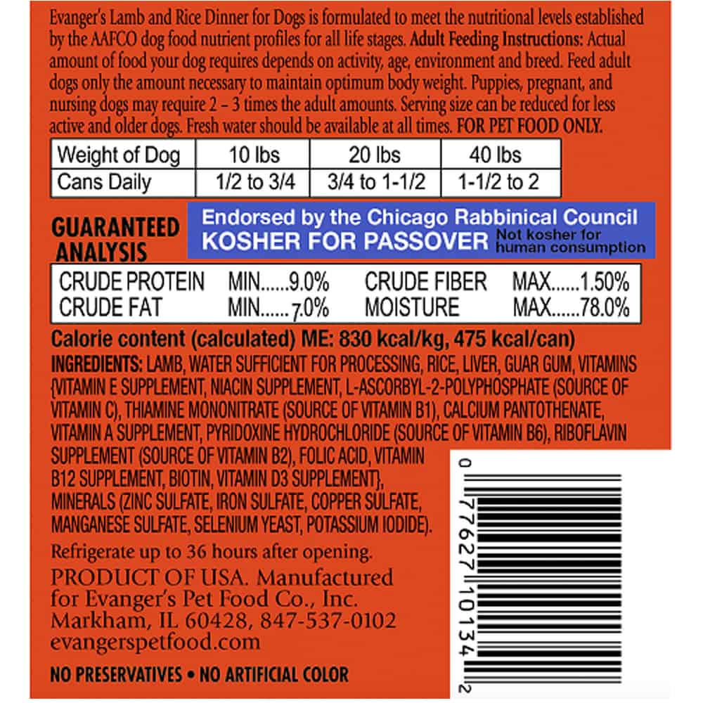 Evanger's Lamb & Rice Dinner is formulated to meet the nutritional levels established by the AAFCO nutrient profiles for all life stages. Puppies, pregnant and nursing dogs may require 2-3 times above amounts, and reduced for less active or older dogs. Amount of food your dog requires depends on activity, age, environment and breed. Lamb & Rice Dinner is endorsed by the cRc Kosher for Passover.