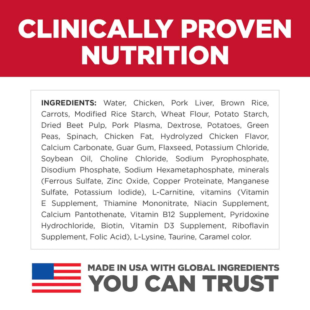 | Water, Chicken, Pork Liver, Brown Rice, Carrots, Modified Rice Starch, Wheat Flour, Potato Starch, Dried Beet Pulp, Pork Plasma, Dextrose, Potatoes, Green Peas, Spinach, Chicken Fat, Hydrolyzed Chicken Flavor, Calcium Carbonate, Guar Gum, Flaxseed, Potassium Chloride, Soybean Oil, Choline Chloride, Sodium Pyrophosphate, Disodium Phosphate, Sodium Hexametaphosphate, minerals (Ferrous Sulfate, Zinc Oxide, Copper Proteinate, Manganese Sulfate, Potassium Iodide), L-Carnitine, vitamins (Vitamin E Supplement, Thiamine Mononitrate, Niacin Supplement, Calcium Pantothenate, Vitamin B12 Supplement, Pyridoxine Hydrochloride, Biotin, Vitamin D3 Supplement, Riboflavin Supplement, Folic Acid), L-Lysine, Taurine, Caramel color. |