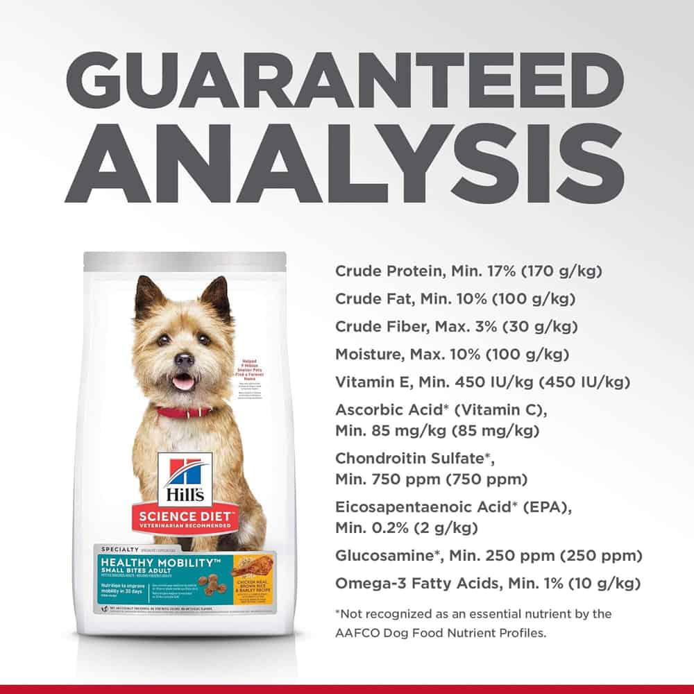 | Animal feeding tests using AAFCO procedures substantiate that Hill's Science Diet Adult Healthy Mobility Small Bites Chicken Meal Brown Rice & Barley Dry Dog Food provides complete and balanced nutrition for maintenance of adult dogs |