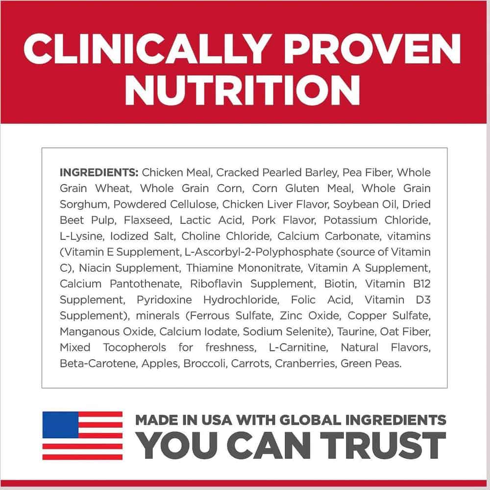 | Chicken Meal, Cracked Pearled Barley, Pea Fiber, Whole Grain Wheat, Whole Grain Corn, Corn Gluten Meal, Whole Grain Sorghum, Powdered Cellulose, Chicken Liver Flavor, Soybean Oil, Dried Beet Pulp, Flaxseed, Lactic Acid, Pork Flavor, Potassium Chloride, L-Lysine, Iodized Salt, Choline Chloride, Calcium Carbonate, vitamins (Vitamin E Supplement, L-Ascorbyl-2-Polyphosphate (source of Vitamin C), Niacin Supplement, Thiamine Mononitrate, Vitamin A Supplement, Calcium Pantothenate, Riboflavin Supplement, Biotin, Vitamin B12 Supplement, Pyridoxine Hydrochloride, Folic Acid, Vitamin D3 Supplement), minerals (Ferrous Sulfate, Zinc Oxide, Copper Sulfate, Manganous Oxide, Calcium Iodate, Sodium Selenite), Taurine, Oat Fiber, Mixed Tocopherols for freshness, L-Carnitine, Natural Flavors, Beta-Carotene, Apples, Broccoli, Carrots, Cranberries, Green Peas |