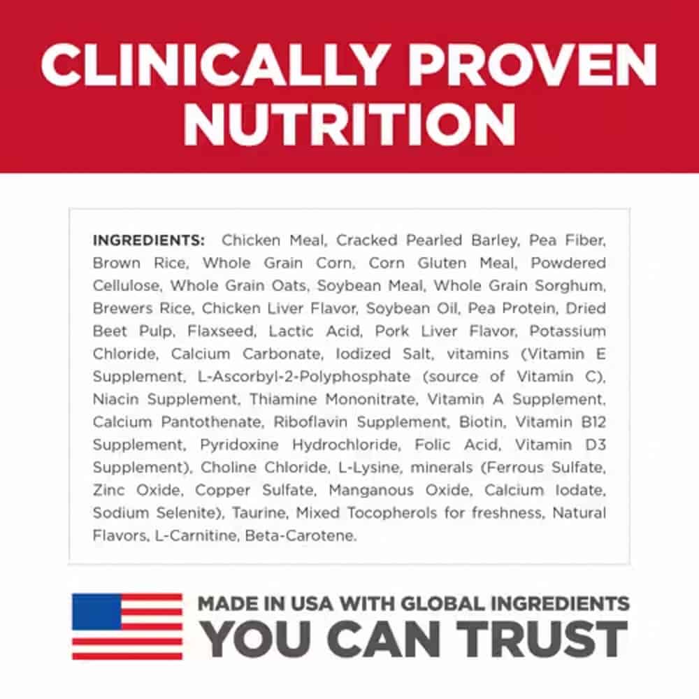 | Chicken Meal, Cracked Pearled Barley, Pea Fiber, Brown Rice, Whole Grain Corn, Corn Gluten Meal, Powdered Cellulose, Whole Grain Oats, Soybean Meal, Whole Grain Sorghum, Brewers Rice, Chicken Liver Flavor, Soybean Oil, Pea Protein, Dried Beet Pulp, Flaxseed, Lactic Acid, Pork Liver Flavor, Potassium Chloride, Calcium Carbonate, Iodized Salt, vitamins (Vitamin E Supplement, L-Ascorbyl-2-Polyphosphate (source of Vitamin C), Niacin Supplement, Thiamine Mononitrate, Vitamin A Supplement, Calcium Pantothenate, Riboflavin Supplement, Biotin, Vitamin B12 Supplement, Pyridoxine Hydrochloride, Folic Acid, Vitamin D3 Supplement), Choline Chloride, L-Lysine, minerals (Ferrous Sulfate, Zinc Oxide, Copper Sulfate, Manganous Oxide, Calcium Iodate, Sodium Selenite), Taurine, Mixed Tocopherols for freshness, Natural Flavors, L-Carnitine, Beta-Carotene |