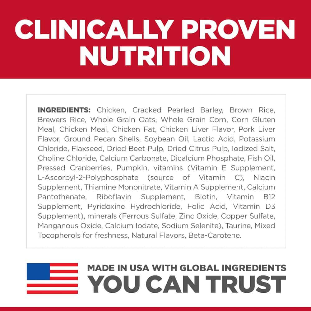 | Chicken, Cracked Pearled Barley, Brown Rice, Brewers Rice, Whole Grain Oats, Whole Grain Corn, Corn Gluten Meal, Chicken Meal, Chicken Fat, Chicken Liver flavour, Pork Liver flavour, Ground Pecan Shells, Soybean Oil, Lactic Acid, Potassium Chloride, Flaxseed, Dried Beet Pulp, Dried Citrus Pulp, Iodized Salt, Choline Chloride, Calcium Carbonate, Dicalcium Phosphate, Fish Oil, Pressed Cranberries, Pumpkin, vitamins (Vitamin E Supplement, L-Ascorbyl-2-Polyphosphate (source of Vitamin C), Niacin Supplement, Thiamine Mononitrate, Vitamin A Supplement, Calcium Pantothenate, Riboflavin Supplement, Biotin, Vitamin B12 Supplement, Pyridoxine Hydrochloride, Folic Acid, Vitamin D3 Supplement), minerals (Ferrous Sulfate, Zinc Oxide, Copper Sulfate, Manganous Oxide, Calcium Iodate, Sodium Selenite), Taurine, Mixed Tocopherols for freshness, Natural flavours, Beta-Carotene |