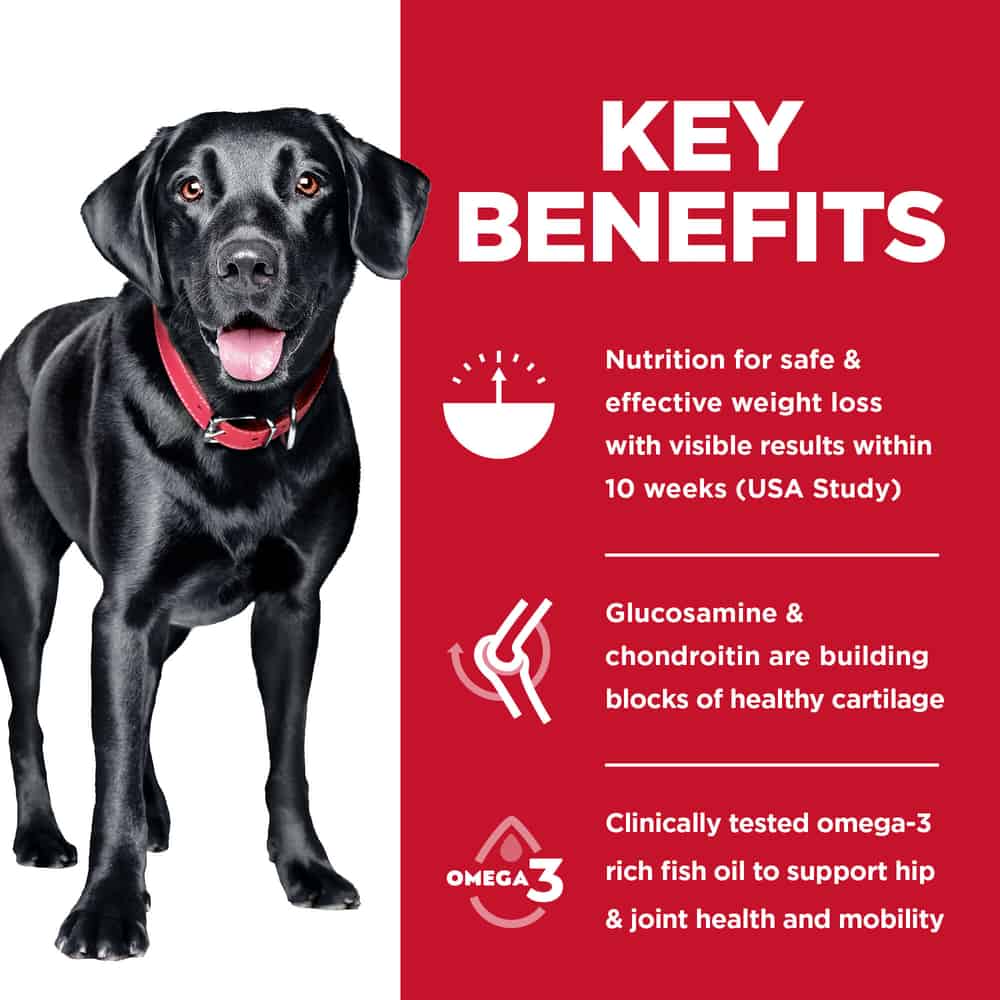 This weight management and mobility support dog food was created with Hill’s unique understanding of the biology of overweight dogs. It provides lean muscle support, and also uses clinically proven antioxidants for a healthy immune system. Over 70% of dogs lost weight within 10 weeks. With added fish oil to provide EPA, an Omega-3, to help support joint function for a mobile & active life. Feed this breakthrough nutrition for your dog’s healthy joints & weight maintenance.