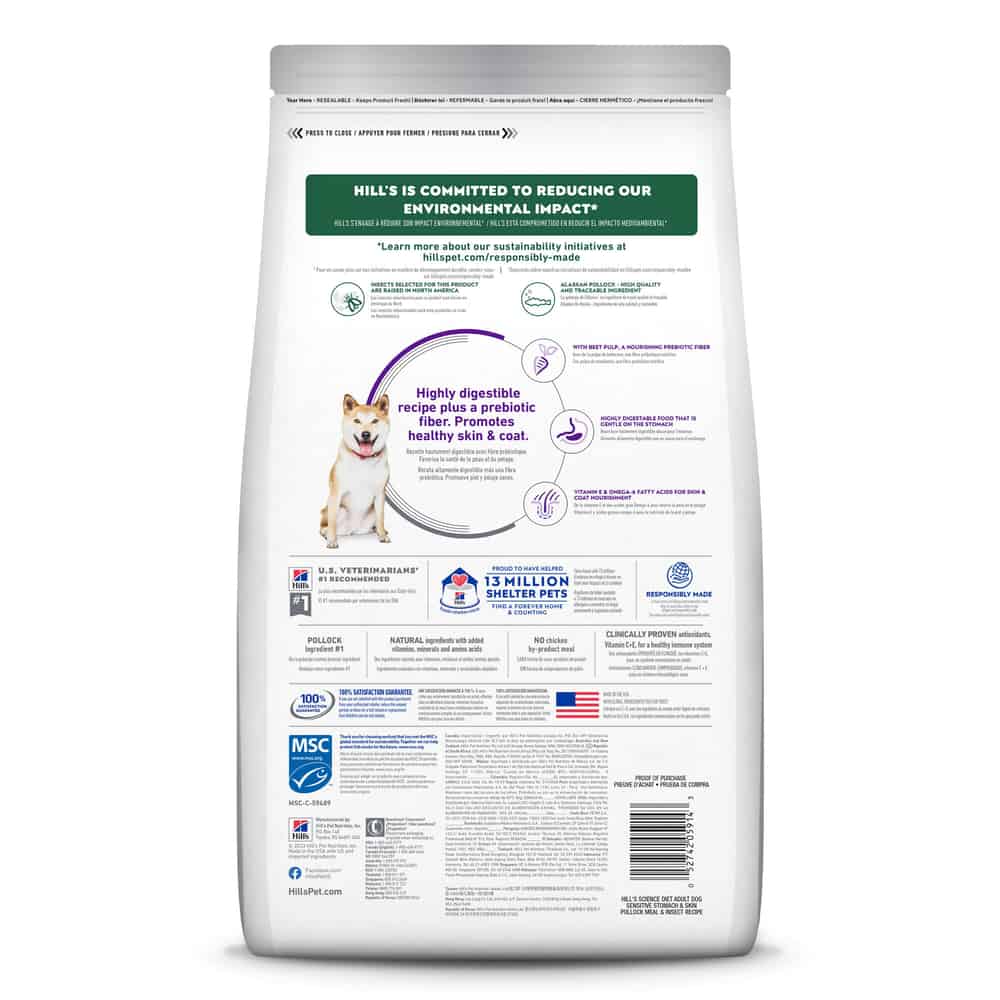 Hill's Science Diet Adult Sensitive Stomach & Skin Pollock Meal & Insect Recipe Dry Dog Food is highly digestible for optimal nutrient absorption & easy stool pick-up. Pollock and insect meal mean this food is filled with healthy protein. It's gentle on stomachs with added fiber while nourishing skin & promoting a lustrous coat with vitamins, minerals, and amino acids.