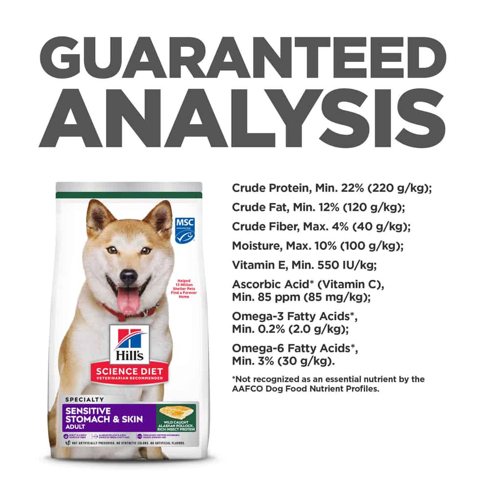 | Animal feeding tests using AAFCO procedures substantiate that Hill's Science Diet Adult Sensitive Stomach & Skin Pollock Meal Barley & Insect Dry Dog Food provides complete and balanced nutrition for maintenance of adult dogs. |