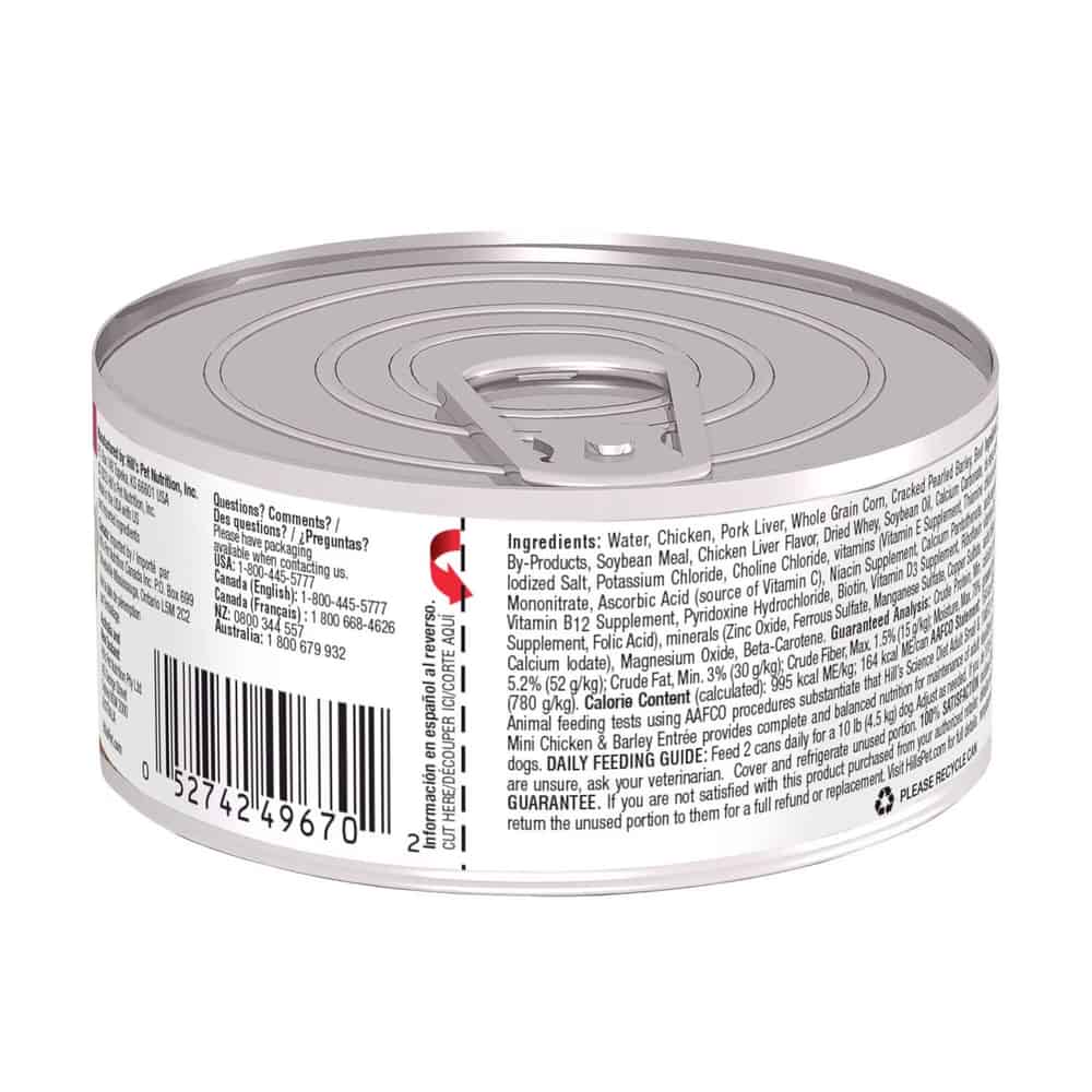 Even little dogs have big appetites, and your small-breed dog is no exception. Hill's Science Diet Adult Small & Mini Chicken & Barley Entrée dog food is tailored nutrition for the unique needs of small & mini dogs during the prime of their life. Packed with quality protein to maintain lean muscle, this canned dog food made with natural ingredients contains an antioxidant blend specially formulated for your little dog.