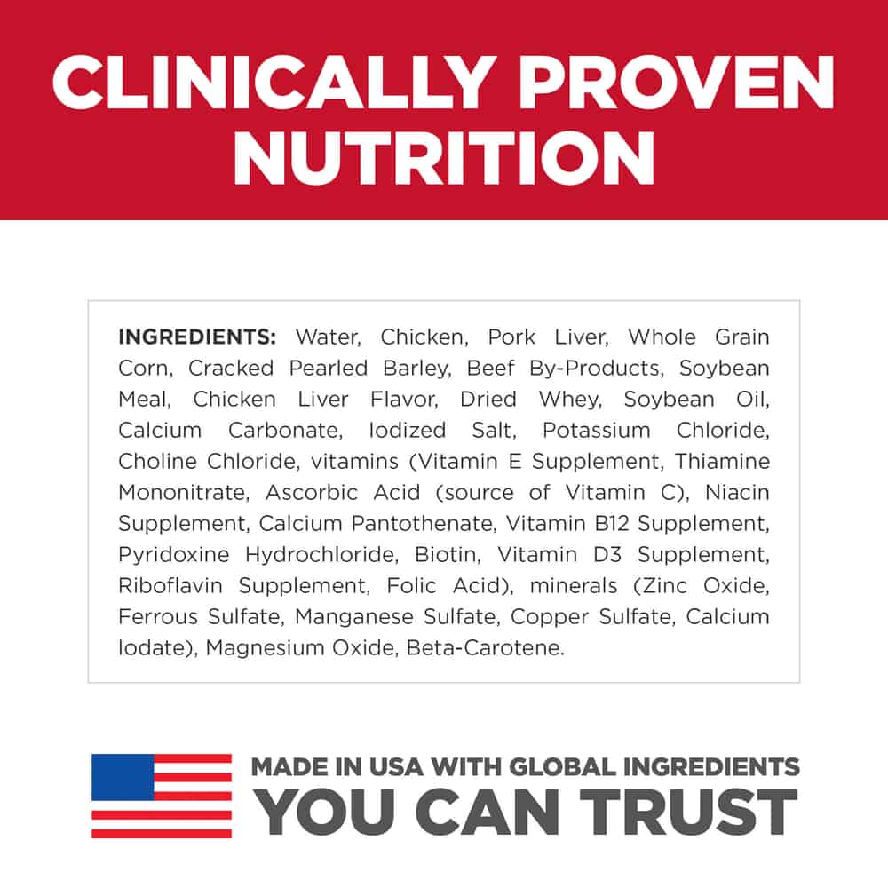 | Water, Chicken, Pork Liver, Whole Grain Corn, Cracked Pearled Barley, Beef By-Products, Soybean Meal, Chicken Liver Flavor, Dried Whey, Soybean Oil, Calcium Carbonate, Iodized Salt, Potassium Chloride, Choline Chloride, vitamins (Vitamin E Supplement, Thiamine Mononitrate, Ascorbic Acid (source of Vitamin C), Niacin Supplement, Calcium Pantothenate, Vitamin B12 Supplement, Pyridoxine Hydrochloride, Biotin, Vitamin D3 Supplement, Riboflavin Supplement, Folic Acid), minerals (Zinc Oxide, Ferrous Sulfate, Manganese Sulfate, Copper Sulfate, Calcium Iodate), Magnesium Oxide, Beta-Carotene. |