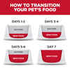 - New to this food? Mix increasing amounts of your pet's new food with decreasing amounts of the old food over a 7-day period.