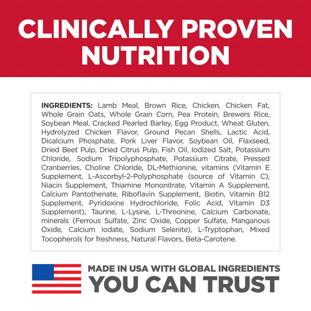 | Lamb Meal, Brown Rice, Chicken, Chicken Fat, Whole Grain Oats, Whole Grain Corn, Pea Protein, Brewers Rice, Soybean Meal, Cracked Pearled Barley, Egg Product, Wheat Gluten, Hydrolyzed Chicken Flavor, Ground Pecan Shells, Lactic Acid, Dicalcium Phosphate, Pork Liver Flavor, Soybean Oil, Flaxseed, Dried Beet Pulp, Dried Citrus Pulp, Fish Oil, Iodized Salt, Potassium Chloride, Sodium Tripolyphosphate, Potassium Citrate, Pressed Cranberries, Choline Chloride, DL-Methionine, vitamins (Vitamin E Supplement, L-Ascorbyl-2-Polyphosphate (source of Vitamin C), Niacin Supplement, Thiamine Mononitrate, Vitamin A Supplement, Calcium Pantothenate, Riboflavin Supplement, Biotin, Vitamin B12 Supplement, Pyridoxine Hydrochloride, Folic Acid, Vitamin D3 Supplement), Taurine, L-Lysine, L-Threonine, Calcium Carbonate, minerals (Ferrous Sulfate, Zinc Oxide, Copper Sulfate, Manganous Oxide, Calcium Iodate, Sodium Selenite), L-Tryptophan, Mixed Tocopherols for freshness, Natural Flavors, Beta-Carotene |