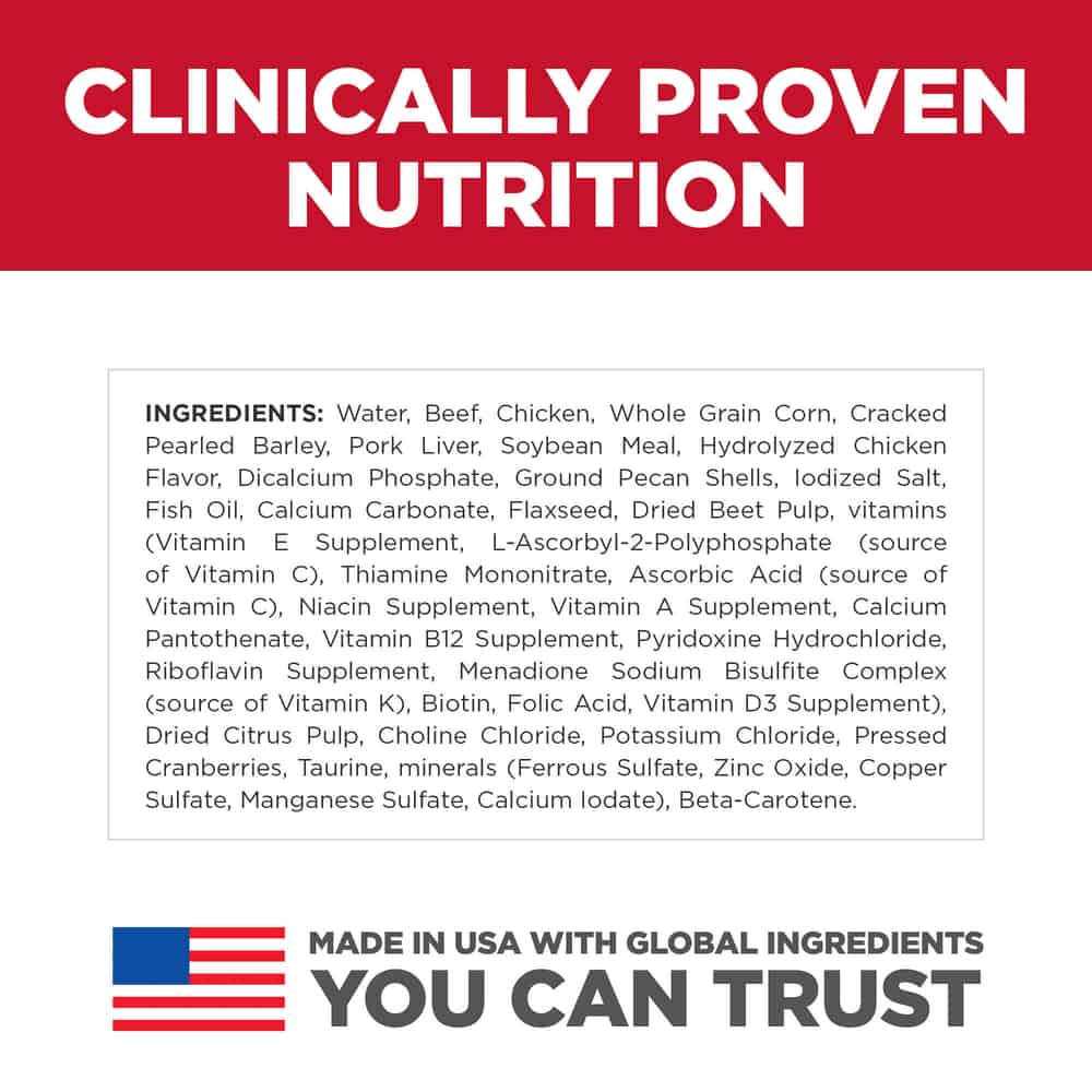 | Water, Beef, Pork Liver, Brown Rice, Carrots, Modified Rice Starch, Wheat Flour, Dried Beet Pulp, Potato Starch, Dextrose, Chicken Fat, Egg Whites, Potatoes, Green Peas, Spinach, Hydrolyzed Chicken Flavor, Calcium Carbonate, Pork Plasma, Dicalcium Phosphate, Potassium Chloride, Flaxseed, Soybean Oil, Caramel color, Guar Gum, minerals (Ferrous Sulfate, Zinc Oxide, Copper Proteinate, Manganese Sulfate, Potassium Iodide), Sodium Pyrophosphate, Disodium Phosphate, Sodium Hexametaphosphate, Choline Chloride, vitamins (Vitamin E Supplement, L-Ascorbyl-2-Polyphosphate (source of Vitamin C), Thiamine Mononitrate, Niacin Supplement, Calcium Pantothenate, Vitamin B12 Supplement, Pyridoxine Hydrochloride, Biotin, Vitamin D3 Supplement, Riboflavin Supplement, Folic Acid), L-Lysine, Magnesium Oxide, Taurine. |
