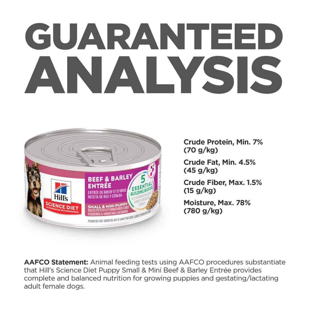 | Animal feeding tests using AAFCO procedures substantiate that Hill's Science Diet Puppy Small & Mini Beef & Barley Entrée provides complete and balanced nutrition for growing puppies and gestating or lactating adult female dogs. |