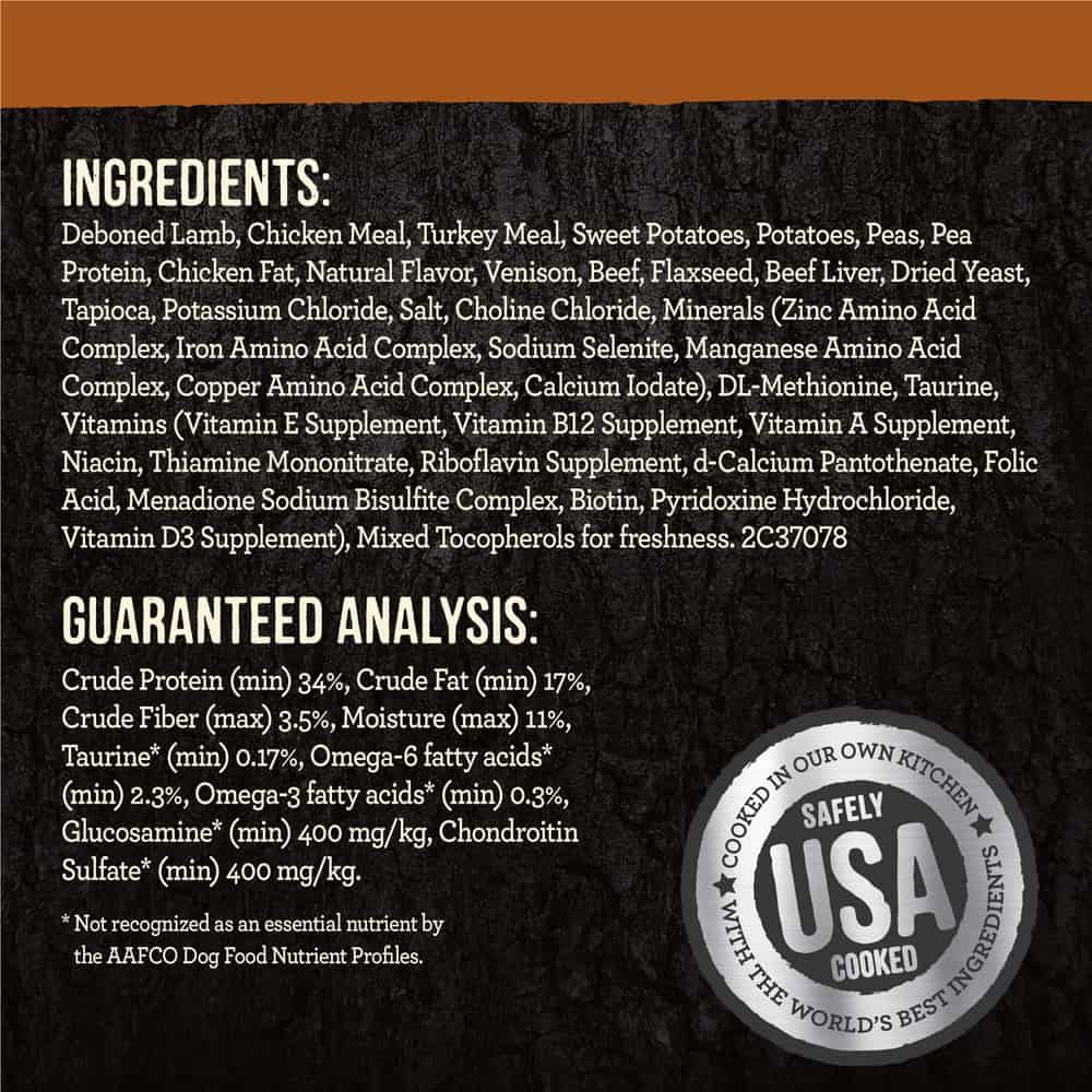 | Ingredients: Deboned Lamb, Chicken Meal, Turkey Meal, Sweet Potatoes, Potatoes, Peas, Pea Protein, Chicken Fat, Natural Flavor, Venison, Beef, Flaxseed, Beef Liver, Dried Yeast, Tapioca, Potassium Chloride, Salt, Choline Chloride, Minerals (Zinc Amino Acid Complex, Iron Amino Acid Complex, Sodium Selenite, Manganese Amino Acid Complex, Copper Amino Acid Complex, Calcium Iodate), DL-Methionine, Taurine, Vitamins (Vitamin E Supplement, Vitamin B12 Supplement, Vitamin A Supplement, Niacin, Thiamine Mononitrate, Riboflavin Supplement, d-Calcium Pantothenate, Folic Acid, Menadione Sodium Bisulfite Complex, Biotin, Pyridoxine Hydrochloride, Vitamin D3 Supplement), Mixed Tocopherols for freshness. |
