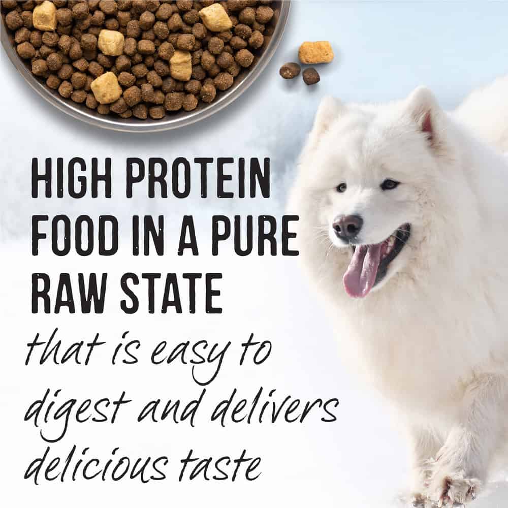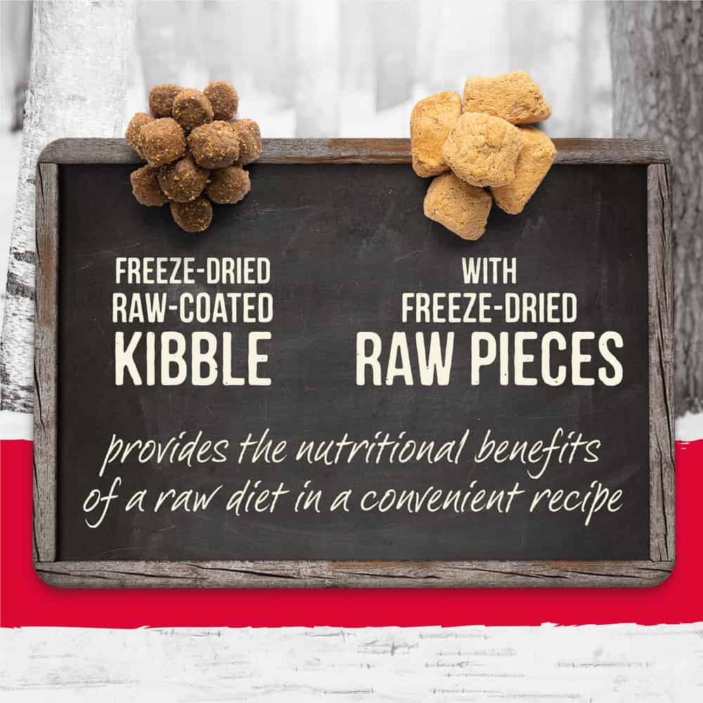 - Natural dog food with raw coated kibble and pieces of freeze dried raw dog food provides dogs with the nutritional benefits they would have discovered in the wild