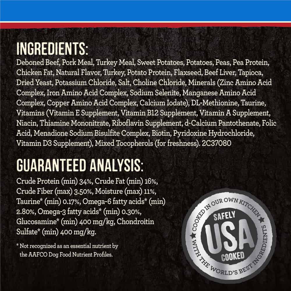 | Ingredients: Deboned Beef, Pork Meal, Turkey Meal, Sweet Potatoes, Potatoes, Peas, Potato Protein, Salmon Meal, Chicken Fat, Pea Protein, Natural Flavor, Turkey, Lamb, Sunflower Oil, Beef Liver, Salt, Organic Dehydrated Alfalfa Meal, Potassium Chloride, Choline Chloride, Apples, Blueberries, Minerals (Iron Amino Acid Complex, Zinc Amino Acid Complex, Zinc Sulfate, Sodium Selenite, Manganese Amino Acid Complex, Copper Amino Acid Complex, Copper Sulfate, Potassium Iodide, Cobalt Proteinate, Cobalt Carbonate), Taurine, Yucca Schidigera Extract, Mixed Tocopherols for freshness, Vitamins (Vitamin E Supplement, Vitamin B12 Supplement, Vitamin A Acetate, d-Calcium Pantothenate, Thiamine Mononitrate, Niacin, Riboflavin Supplement, Biotin, Vitamin D3 Supplement, Folic Acid, Pyridoxine Hydrochloride), Citric Acid for freshness, Dried Lactobacillus plantarum Fermentation Product, Dried Lactobacillus casei Fermentation Product, Dried Enterococcus faecium Fermentation Product, Dried Lactobacillus acidophilus Fermentation Product. |