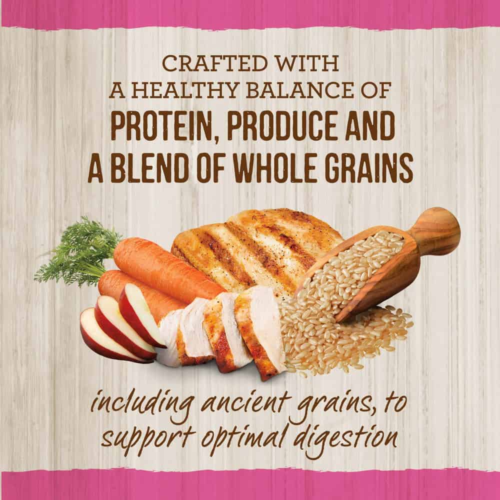 This natural dog food also features a healthy blend of grains, including quinoa and ancient grains, to support healthy digestion. Leading levels of glucosamine and chondroitin are added to support your small breed dog’s healthy hips and joints, while omega-6 and omega-3 fatty acids support their healthy skin and coat. Crafted with a healthy balance of protein, produce, and a blend of whole grains, this potato free dog food has no peas or lentils.