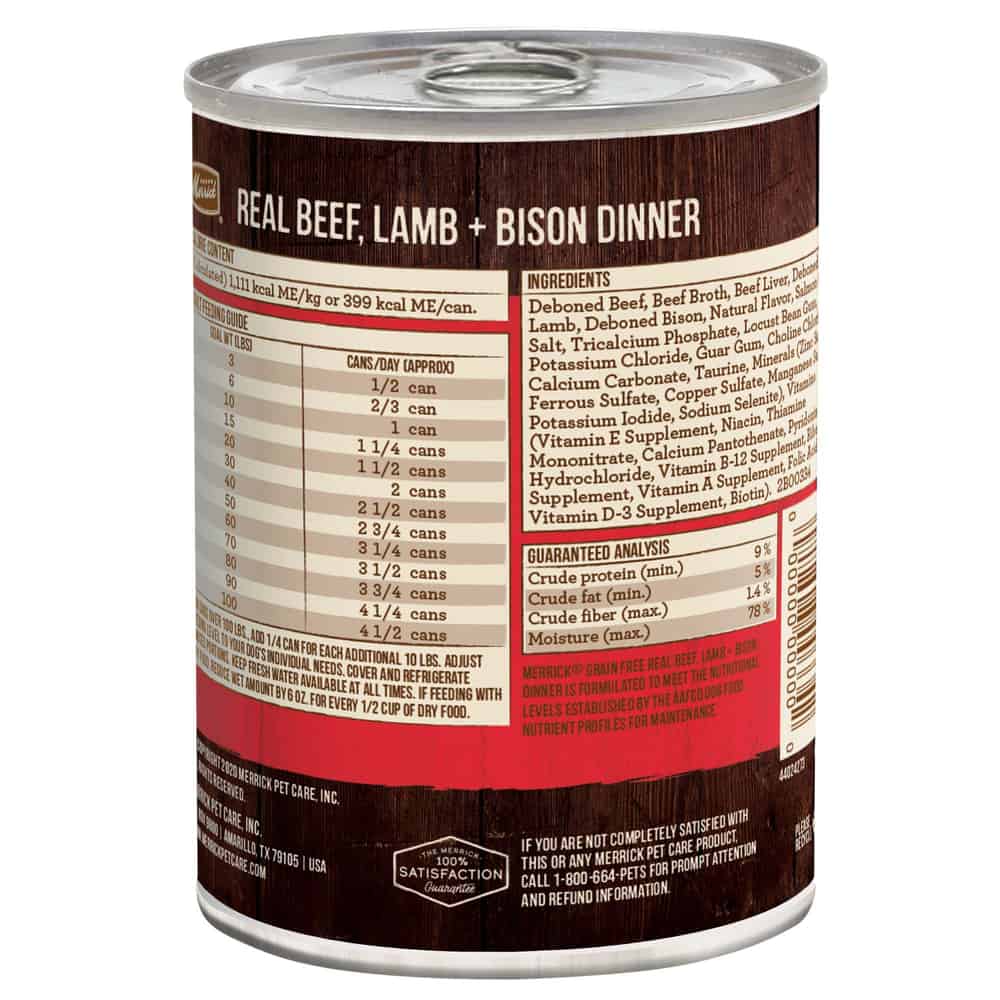 - Merrick Grain Free Wet Dog Food Real Beef, Lamb and Bison Dinner, Canned Dog Food
