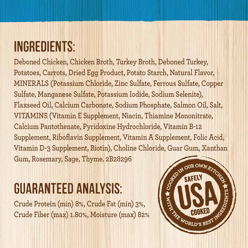 | Ingredients: Deboned Chicken, Chicken Broth, Turkey Broth, Deboned Turkey, Potatoes, Carrots, Dried Egg Product, Potato Starch, Natural Flavor, Minerals (Potassium Chloride, Zinc Sulfate, Ferrous Sulfate, Copper Sulfate, Manganese Sulfate, Potassium Iodide, Sodium Selenite), Flaxseed Oil, Calcium Carbonate, Sodium Phosphate, Salmon Oil, Salt, Vitamins (Vitamin E Supplement, Niacin, Thiamine Mononitrate, Calcium Pantothenate, Pyridoxine Hydrochloride, Vitamin B-12 Supplement, Riboflavin Supplement, Vitamin A Supplement, Folic Acid, Vitamin D-3 Supplement, Biotin), Choline Chloride, Guar Gum, Xanthan Gum, Rosemary, Sage, Thyme. |