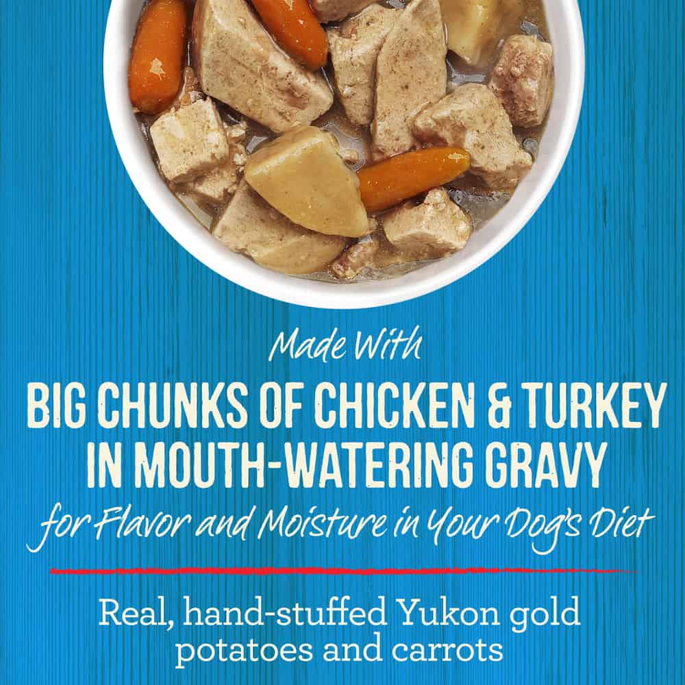 - Healthy dog food with vegetables like hand-stuffed potatoes and carrots with big chunks of chicken and turkey, prepared in a savory dog food gravy for added moisture