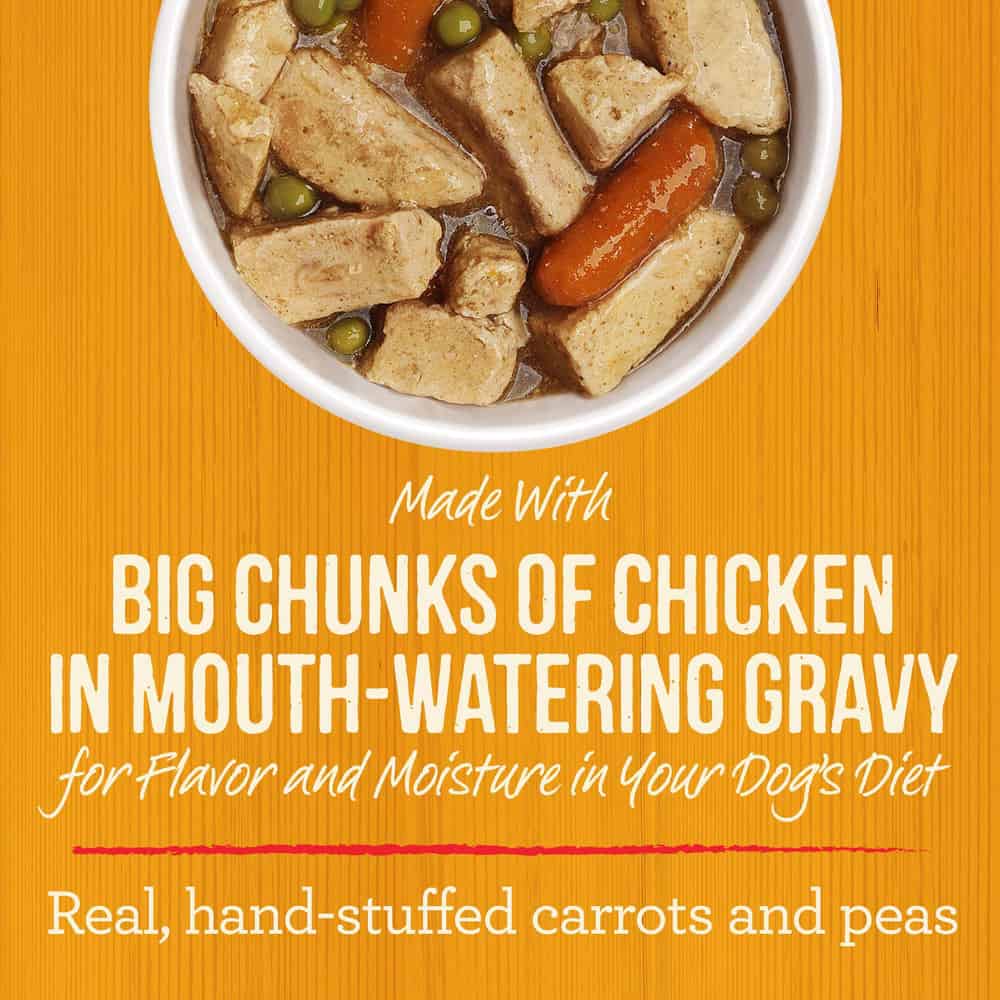 - Healthy dog food with vegetables like hand-stuffed peas and carrots and big chunks of chicken, prepared in a savory dog food gravy for added moisture