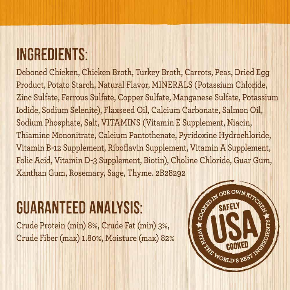 | Ingredients: Deboned Chicken, Chicken Broth, Turkey Broth, Carrots, Peas, Dried Egg Product, Potato Starch, Natural Flavor, Minerals (Potassium Chloride, Zinc Sulfate, Ferrous Sulfate, Copper Sulfate, Manganese Sulfate, Potassium Iodide, Sodium Selenite), Flaxseed Oil, Calcium Carbonate, Salmon Oil, Sodium Phosphate, Salt, Vitamins (Vitamin E Supplement, Niacin, Thiamine Mononitrate, Calcium Pantothenate, Pyridoxine Hydrochloride, Vitamin B-12 Supplement, Riboflavin Supplement, Vitamin A Supplement, Folic Acid, Vitamin D-3 Supplement, Biotin), Choline Chloride, Guar Gum, Xanthan Gum, Rosemary, Sage, Thyme. |