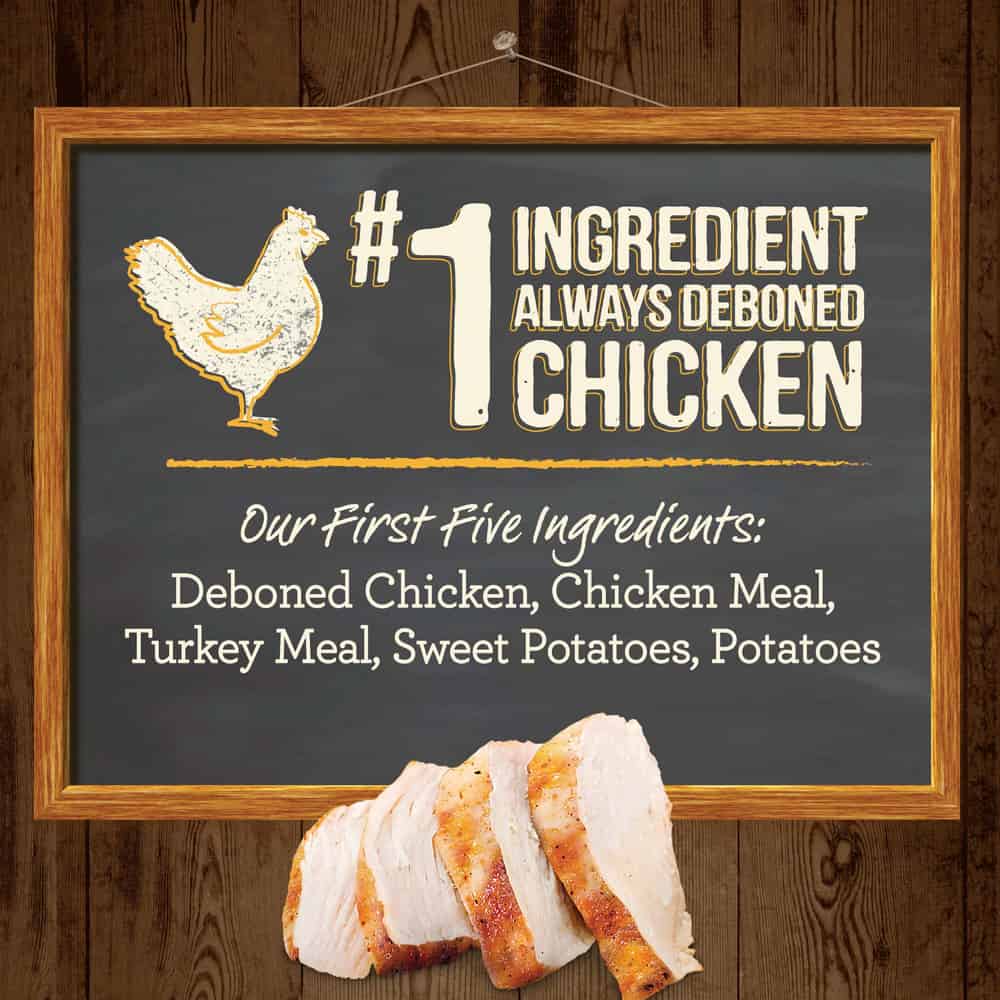 - Real deboned chicken is always the first ingredient in this large breed dog food with 60% protein and healthy fat ingredients and 40% produce, fiber, vitamins, minerals and other natural ingredients With 80% of protein from animal sources, this healthy dog food recipe offers the ideal combination of protein and healthy fats to help a dog maintain optimal weight and increased energy