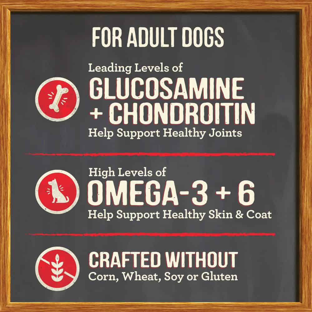 - High protein dog food with omega fatty acids to support healthy skin and shiny coat, plus glucosamine and chondroitin for dogs to help maintain healthy hips and joints