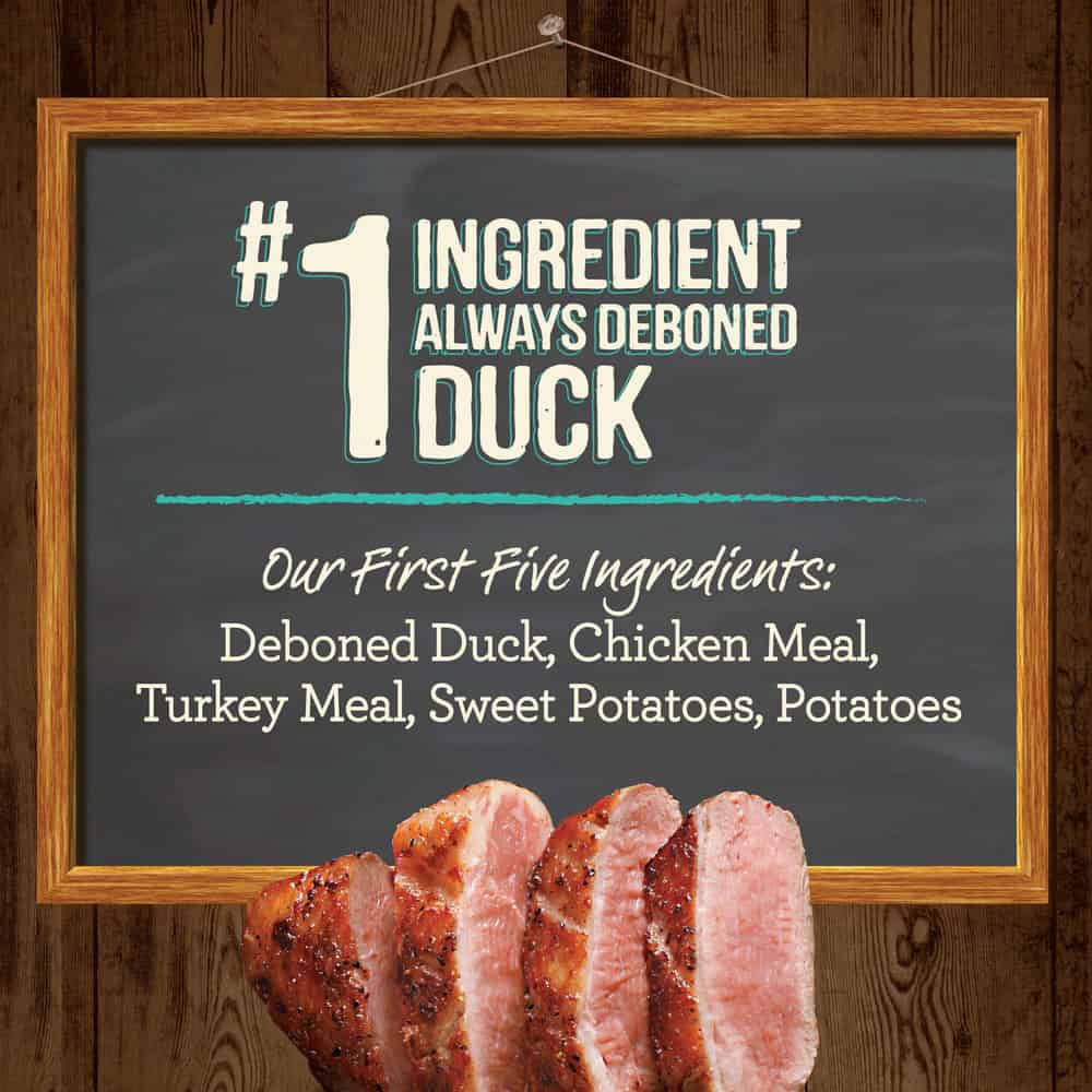 - Real deboned duck is always the first ingredient. Dry food for dogs with 65% protein and healthy fat ingredients and 35% produce, fiber, vitamins, minerals and other natural ingredients