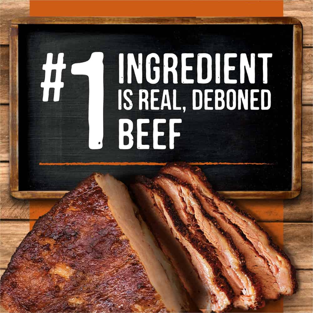 - Real deboned beef is always the first ingredient in this real meat dog food grain free recipe The high-quality protein in this adult dog food helps build and maintain healthy muscle tissue and energy levels and offers complete and balanced nutrition for all breed sizes