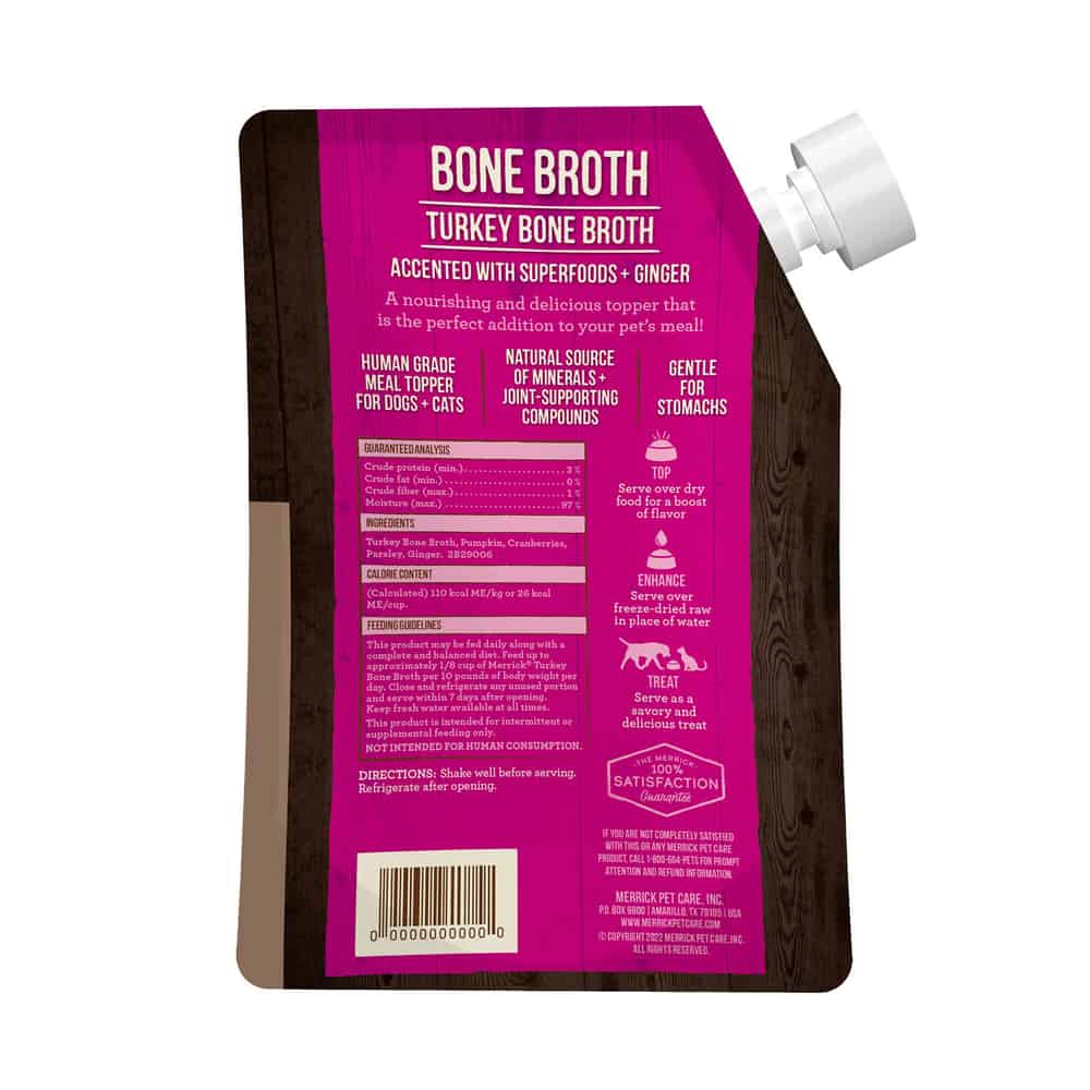- Merrick Grain Free Turkey Bone Broth, Human Grade Dog Food Meal Topper and Cat Bone Broth
