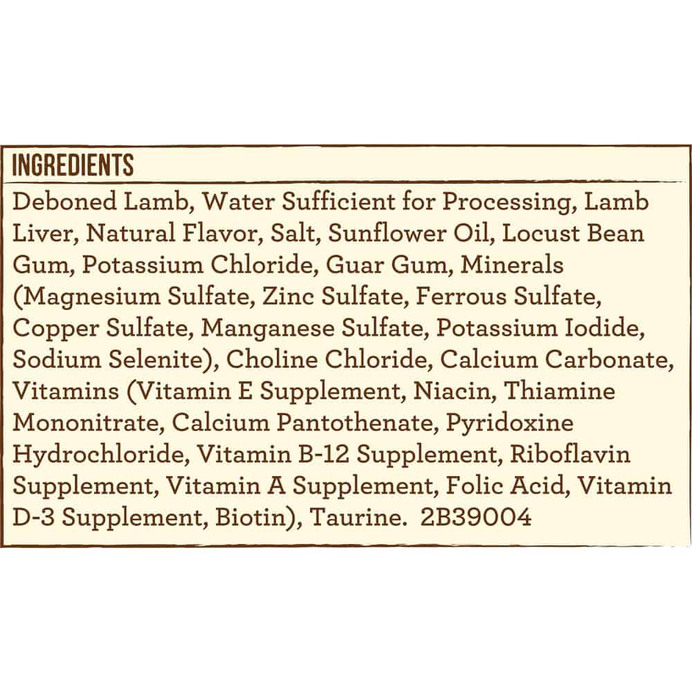 | Ingredients: Deboned Lamb, Water Sufficient for Processing, Lamb Liver, Natural Flavor, Salt, Sunflower Oil, Locust Bean Gum, Potassium Chloride, Guar Gum, Minerals (Magnesium Sulfate, Zinc Sulfate, Ferrous Sulfate, Copper Sulfate, Manganese Sulfate, Potassium Iodide, Sodium Selenite), Choline Chloride, Calcium Carbonate, Vitamins (Vitamin E Supplement, Niacin, Thiamine Mononitrate, Calcium Pantothenate, Pyridoxine Hydrochloride, Vitamin B-12 Supplement, Riboflavin Supplement, Vitamin A Supplement, Folic Acid, Vitamin D-3 Supplement, Biotin), Taurine. |