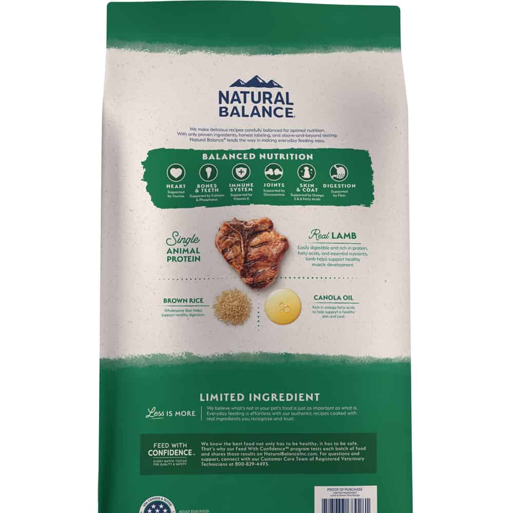 Premium dog food for adult dogs of all sizes Produced in the USA with the world's finest ingredients Features real lamb as the #1 ingredient Provides essential amino acids to help build strong muscles Contains fiber to help support healthy digestion Includes no added potatoes, corn, fillers, wheat or soy Backed by the Natural Balance Buy With Confidence promise, so you know it's healthy, tasty and safe