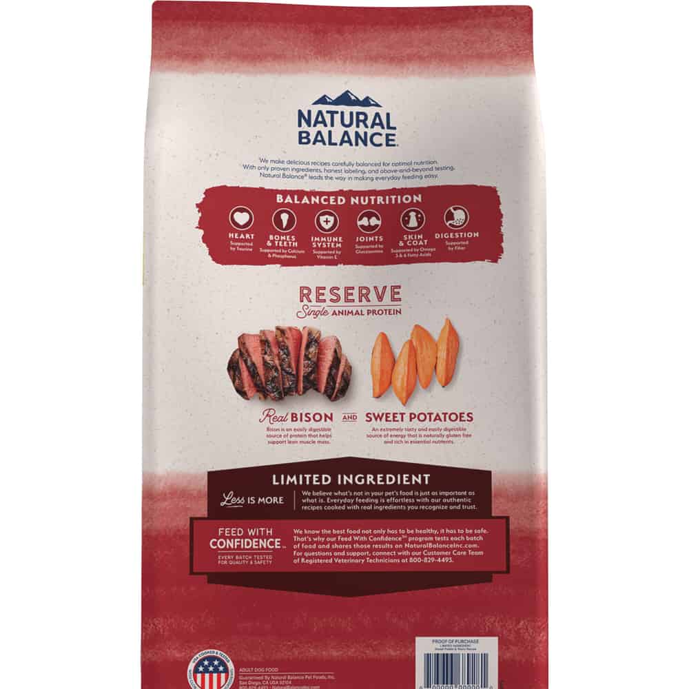 Sometimes what’s NOT in your dog’s food is just as important as what is. That’s the guiding philosophy behind Natural Balance L.I.D. Limited Ingredient Diets Sweet Potato & Bison Formula, a super premium dry dog food made to help feed your dog’s greatness. Our sweet potato and bison formula is crafted with purposefully selected ingredients: gluten-free carbohydrate sources to help provide your dog with energy and a single source of animal protein to help maintain strong, lean muscle. What you won’t find on our carefully crafted ingredients list are fillers, added corn, wheat or soy, or artificial flavors, colors or preservatives. Everything is chosen to provide a complete and balanced diet that helps support the nutritional needs of adult dogs big and small. Turns out the simplest choice is all you need to feed your dog with confidence