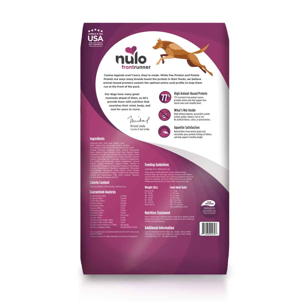 - PORK, BARLEY, & BEEF RECIPE - Nulo Frontrunner All Breed Adult Dog Food with ancient-grains supports and maintains your pet's digestion and immune system with antioxidants and probiotics.