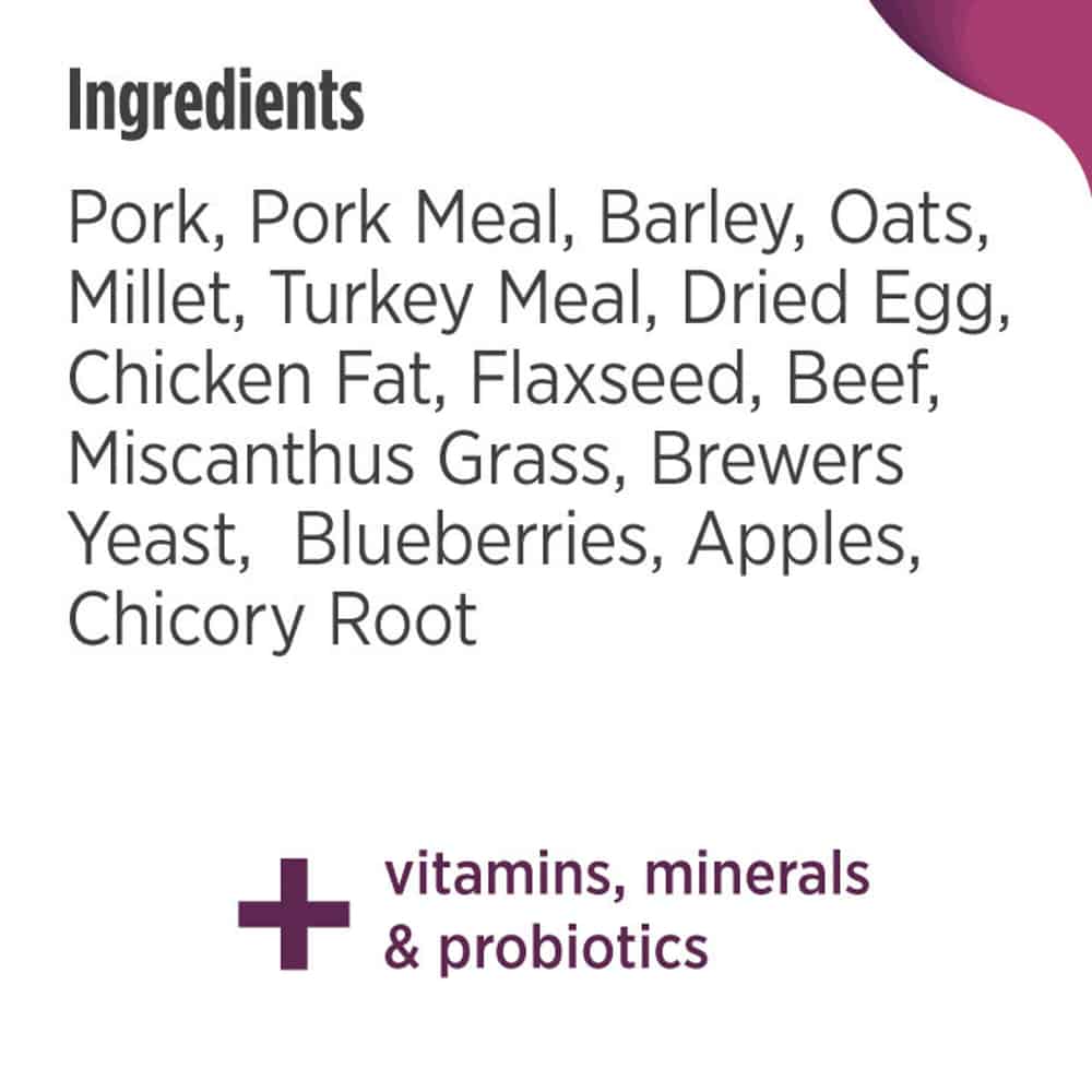 | Deboned Pork, Pork Meal, Barley, Oats, Millet, Turkey Meal, Dried Egg Product, Chicken Fat (preserved with Mixed Tocopherols & Citric Acid), Ground Flaxseed, Deboned Beef, Ground Miscanthus Grass, Natural Flavor, Brewers Dried Yeast, Natural Flavor, Potassium Chloride, Dried Blueberries, Dried Apples, Dried Chicory Root, Salt, DL-Methionine, Choline Chloride, Taurine, Calcium Carbonate, Zinc Proteinate, Vitamin E Supplement, Zinc Sulfate, Iron Proteinate, Niacin Supplement, Ferrous Sulfate, Copper Proteinate, Copper Sulfate, Vitamin A Supplement, Manganese Proteinate, Thiamine Mononitrate, Calcium Pantothenate, Riboflavin Supplement, Pyridoxine Hydrochloride, Manganous Oxide, Biotin, Dried Bacillus coagulans Fermentation Product, Vitamin B12 Supplement, Vitamin D3 Supplement, Folic Acid, Sodium Selenite, Calcium Iodate, Rosemary Extract. |