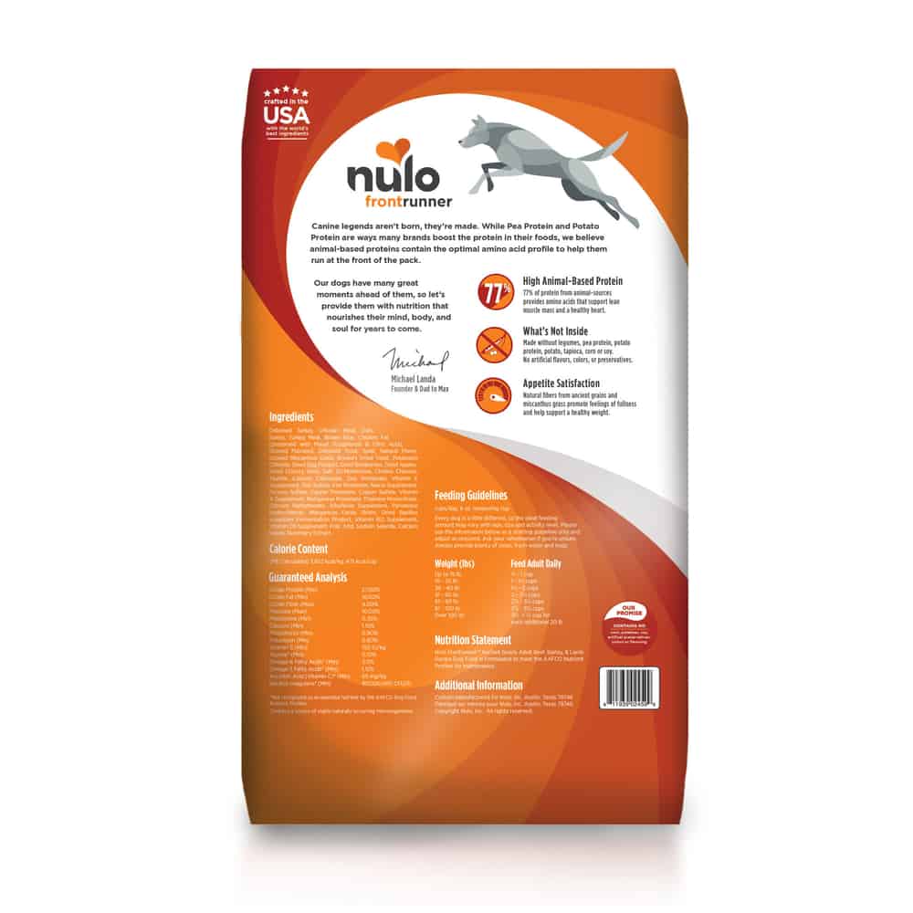 | Nulo Frontrunner™ Ancient Grains Adult Turkey, Trout, & Spelt Recipe Dog Food is formulated to meet the AAFCO Dog Food Nutrient Profiles for maintenance. |