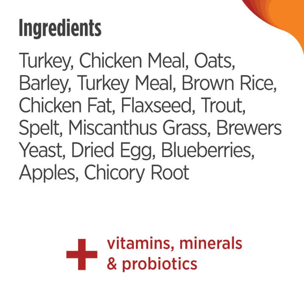 | Deboned Turkey, Chicken Meal, Oats, Barley, Turkey Meal, Brown Rice, Chicken Fat (preserved with Mixed Tocopherols & Citric Acid), Ground Flaxseed, Deboned Trout, Spelt, Natural Flavor, Ground Miscanthus Grass, Brewers Dried Yeast, Potassium Chloride, Dried Egg Product, Dried Blueberries, Dried Apples, Dried Chicory Root, Salt, DL-Methionine, Choline Chloride, Taurine, Calcium Carbonate, Zinc Proteinate, Vitamin E Supplement, Zinc Sulfate, Iron Proteinate, Niacin Supplement, Ferrous Sulfate, Copper Proteinate, Copper Sulfate, Vitamin A Supplement, Manganese Proteinate, Thiamine Mononitrate, Calcium Pantothenate, Riboflavin Supplement, Pyridoxine Hydrochloride, Manganous Oxide, Biotin, Dried Bacillus coagulans Fermentation Product, Vitamin B12 Supplement, Vitamin D3 Supplement, Folic Acid, Sodium Selenite, Calcium Iodate, Rosemary Extract. |