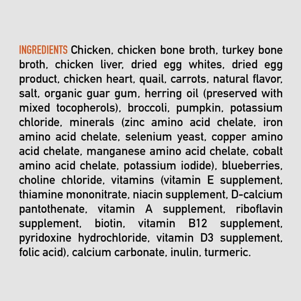 | Chicken, chicken bone broth, turkey bone broth, chicken liver, dried egg whites, dried egg product, chicken heart, quail, carrots, natural flavor, salt, organic guar gum, herring oil (preserved with mixed tocopherols), broccoli, pumpkin, potassium chloride, minerals (zinc amino acid chelate, iron amino acid chelate, selenium yeast, copper amino acid chelate, manganese amino acid chelate, cobalt amino acid chelate, potassium iodide), blueberries, choline chloride, vitamins (vitamin E supplement, thiamine mononitrate, niacin supplement, D-calcium pantothenate, vitamin A supplement, riboflavin supplement, biotin, vitamin B12 supplement, pyridoxine hydrochloride, vitamin D3 supplement, folic acid), calcium carbonate, inulin, turmeric. |