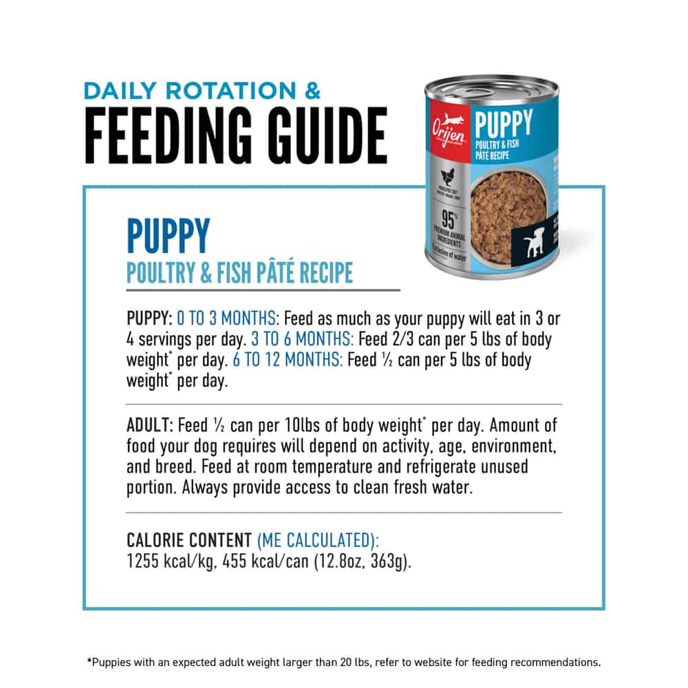 | Dietary Note | ORIJEN® Puppy Poultry & Fish Pâté Recipe Dog Food is formulated to meet the nutritional levels established by the AAFCO Dog Food Nutrient Profiles for growth and maintenance including growth of large size dogs (70 lb. or more as an adult). |