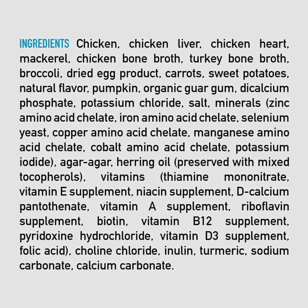 | Chicken, chicken liver, chicken heart, mackerel, chicken bone broth, turkey bone broth, broccoli, dried egg product, carrots, sweet potatoes, natural flavor, pumpkin, organic guar gum, dicalcium phosphate, potassium chloride, salt, minerals (zinc amino acid chelate, iron amino acid chelate, selenium yeast, copper amino acid chelate, manganese amino acid chelate, cobalt amino acid chelate, potassium iodide), agar-agar, herring oil (preserved with mixed tocopherols), vitamins (thiamine mononitrate, vitamin E supplement, niacin supplement, D-calcium pantothenate, vitamin A supplement, riboflavin supplement, biotin, vitamin B12 supplement, pyridoxine hydrochloride, vitamin D3 supplement, folic acid), choline chloride, inulin, turmeric, sodium carbonate, calcium carbonate. |