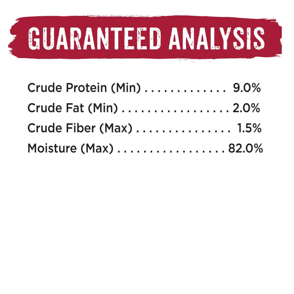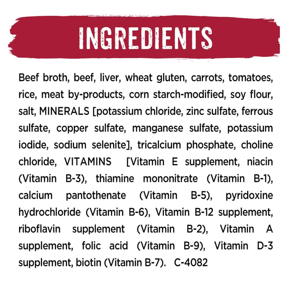 | Beef Broth, Beef, Liver, Wheat Gluten, Carrots, Tomatoes, Rice, Meat By-Products, Corn Starch-Modified, Soy Flour, Salt, Minerals [Potassium Chloride, Zinc Sulfate, Ferrous Sulfate, Copper Sulfate, Manganese Sulfate, Potassium Iodide, Sodium Selenite], Tricalcium Phosphate, Choline Chloride, Vitamins [Vitamin E Supplement, Niacin (Vitamin B-3), Thiamine Mononitrate (Vitamin B-1), Calcium Pantothenate (Vitamin B-5), Pyridoxine Hydrochloride (Vitamin B-6), Vitamin B-12 Supplement, Riboflavin Supplement (Vitamin B-2), Vitamin A Supplement, Folic Acid (Vitamin B-9), Vitamin D-3 Supplement, Biotin (Vitamin B-7)]. C-4082. |