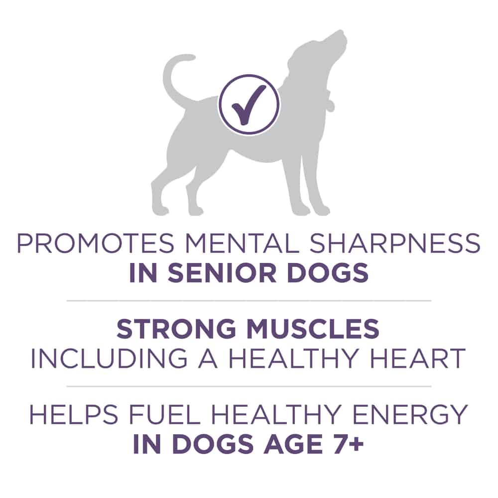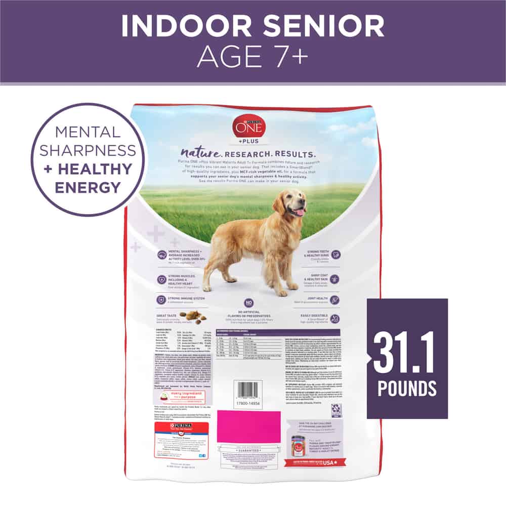 - Purina dog food for senior dogs with MCT-rich vegetable oil to nourish and promote mental sharpness and shows an increased average activity level of over 20 percent in dogs seven and older