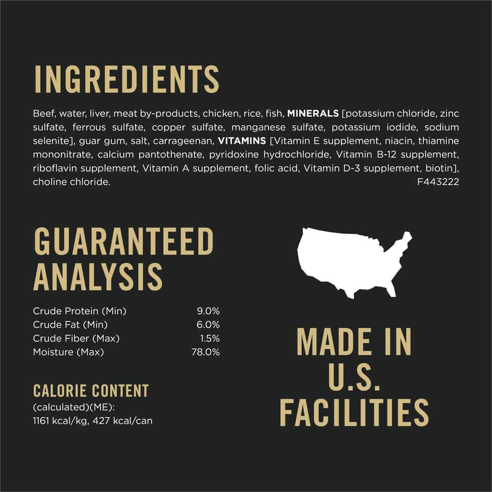 | Beef, Water, Liver, Meat By-Products, Chicken, Rice, Fish, MINERALS [Potassium Chloride, Zinc Sulfate, Ferrous Sulfate, Copper Sulfate, Manganese Sulfate, Potassium Iodide, Sodium Selenite], Guar Gum, Salt, Carrageenan, VITAMINS [Vitamin E Supplement, Niacin, Thiamine Mononitrate, Calcium Pantothenate, Pyridoxine Hydrochloride, Vitamin B-12 Supplement, Riboflavin Supplement, Vitamin A Supplement, Folic Acid, Vitamin D-3 Supplement, Biotin], Choline Chloride. F443222 |