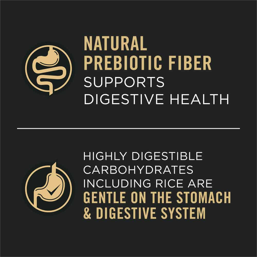 - Natural prebiotic fiber in our salmon and rice dog food formula nourishes specific intestinal bacteria for digestive health.