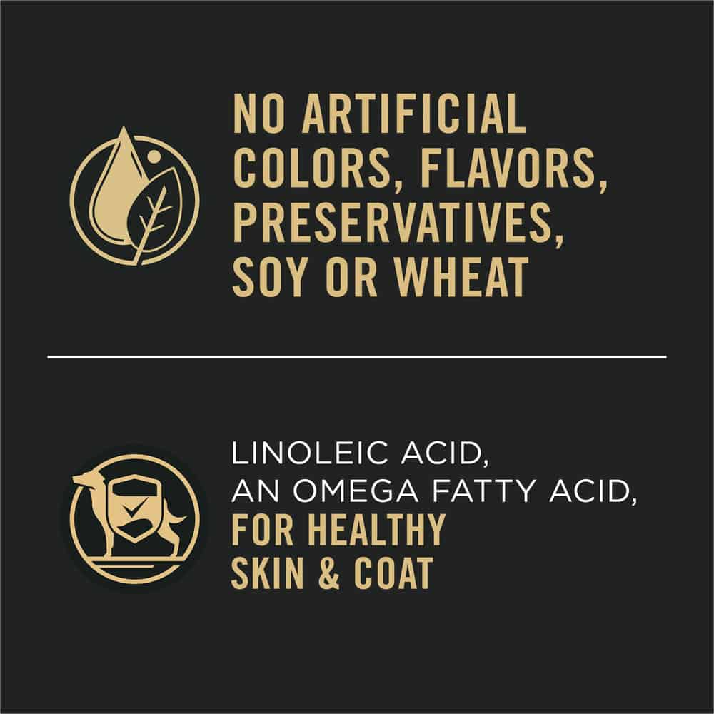 - Sensitive skin dog food includes linoleic acid, an omega fatty acid, for healthy skin and coat and contains no artificial colors, flavors or preservatives.