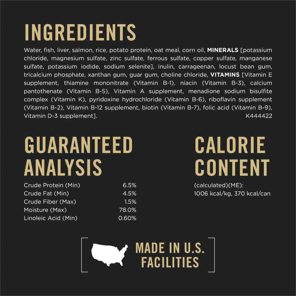 | Water, Fish, Salmon, Rice, Potato Protein, Corn Oil, Carrots, Inulin, MINERALS [Potassium Chloride, Zinc Sulfate, Ferrous Sulfate, Copper Sulfate, Manganese Sulfate, Potassium Iodide, Sodium Selenite], Carrageenan, Locust Bean Gum, Xanthan Gum, Guar Gum, Tricalcium Phosphate, Magnesium Sulfate, Choline Chloride, VITAMINS [Vitamin E Supplement, Thiamine Mononitrate (Vitamin B-1), Niacin (Vitamin B-3), Calcium Pantothenate (Vitamin B-5), Vitamin A Supplement, Menadione Sodium Bisulfite Complex (Vitamin K), Pyridoxine Hydrochloride (Vitamin B-6), Riboflavin Supplement (Vitamin B-2), Vitamin B-12 Supplement, Biotin (Vitamin B-7), Folic Acid (Vitamin B-9), Vitamin D-3 Supplement]. J444421 |