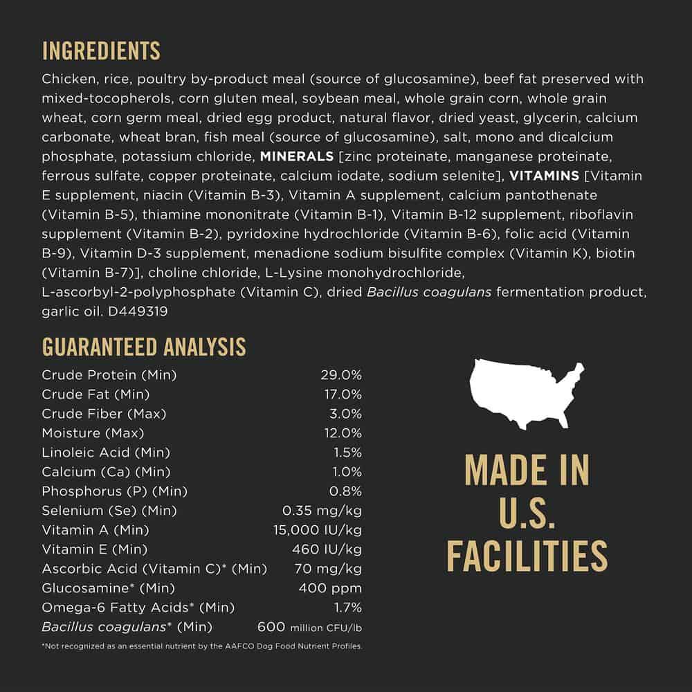 | Chicken, Rice, Poultry By-product Meal (Source Of Glucosamine), Beef Fat Preserved With Mixed-tocopherols, Corn Gluten Meal, Soybean Meal, Whole Grain Corn, Whole Grain Wheat, Corn Germ Meal, Dried Egg Product, Natural Flavor, Dried Yeast, Glycerin, Calcium Carbonate, Wheat Bran, Fish Meal (Source Of Glucosamine), Salt, Mono And Dicalcium Phosphate, Potassium Chloride, Minerals [Zinc Proteinate, Manganese Proteinate, Ferrous Sulfate, Copper Proteinate, Calcium Iodate, Sodium Selenite], Vitamins [Vitamin E Supplement, Niacin (Vitamin B-3), Vitamin A Supplement, Calcium Pantothenate (Vitamin B-5), Thiamine Mononitrate (Vitamin B-1), Vitamin B-12 Supplement, Riboflavin Supplement (Vitamin B-2), Pyridoxine Hydrochloride (Vitamin B-6), Folic Acid (Vitamin B-9), Vitamin D-3 Supplement, Menadione Sodium Bisulfite Complex (Vitamin K), Biotin (Vitamin B-7)], Choline Chloride, L-lysine Monohydrochloride, L-ascorbyl-2-polyphosphate (Vitamin C), Dried Bacillus Coagulans Fermentation Product, Garlic Oil. D449319 |