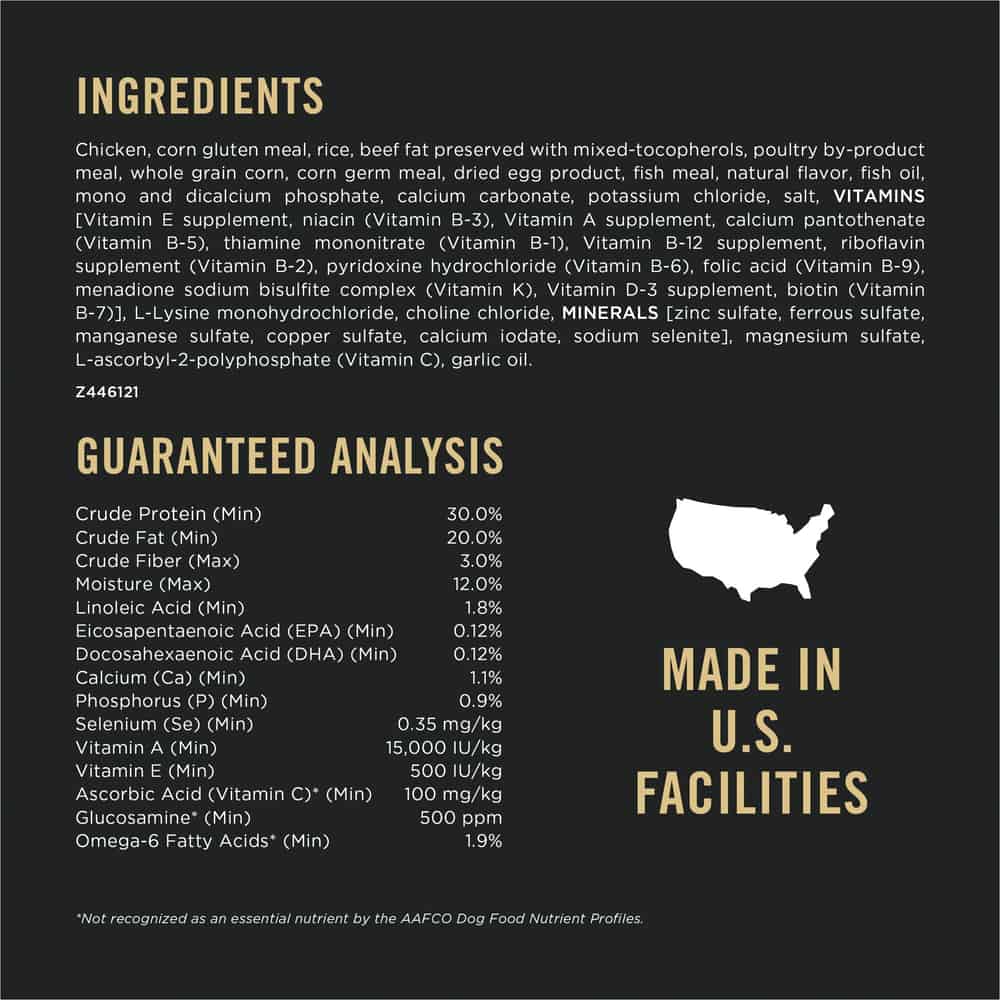 | Chicken, Corn Gluten Meal, Rice, Beef Fat Preserved With Mixed-Tocopherols, Poultry By-Product Meal, Whole Grain Corn, Corn Germ Meal, Dried Egg Product, Fish Meal, Natural Flavor, Fish Oil, Mono And Dicalcium Phosphate, Calcium Carbonate, Potassium Chloride, Salt, VITAMINS [Vitamin E Supplement, Niacin (Vitamin B-3), Vitamin A Supplement, Calcium Pantothenate (Vitamin B-5), Thiamine Mononitrate (Vitamin B-1), Vitamin B-12 Supplement, Riboflavin Supplement (Vitamin B-2), Pyridoxine Hydrochloride (Vitamin B-6), Folic Acid (Vitamin B-9), Menadione Sodium Bisulfite Complex (Vitamin K), Vitamin D-3 Supplement, Biotin (Vitamin B-7)], L-Lysine Monohydrochloride, Choline Chloride, MINERALS [Zinc Sulfate, Ferrous Sulfate, Manganese Sulfate, Copper Sulfate, Calcium Iodate, Sodium Selenite], Magnesium Sulfate, L-Ascorbyl-2-Polyphosphate (Vitamin C), Garlic Oil. Z446121 |