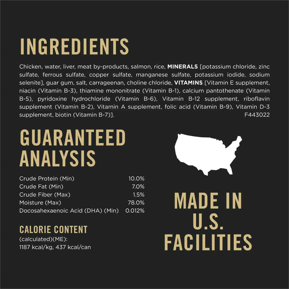 | Chicken, Liver, Meat By-Products, Water, Salmon, Rice, MINERALS [Potassium Chloride, Zinc Sulfate, Ferrous Sulfate, Copper Sulfate, Manganese Sulfate, Potassium Iodide, Sodium Selenite], Guar Gum, Salt, Carrageenan, Choline Chloride, VITAMINS [Vitamin E Supplement, Niacin (Vitamin B-3), Thiamine Mononitrate (Vitamin B-1), Calcium Pantothenate (Vitamin B-5), Pyridoxine Hydrochloride (Vitamin B-6), Vitamin B-12 Supplement, Riboflavin Supplement (Vitamin B-2), Vitamin A Supplement, Folic Acid (Vitamin B-9), Vitamin D-3 Supplement, Biotin (Vitamin B-7)]. E443020 |