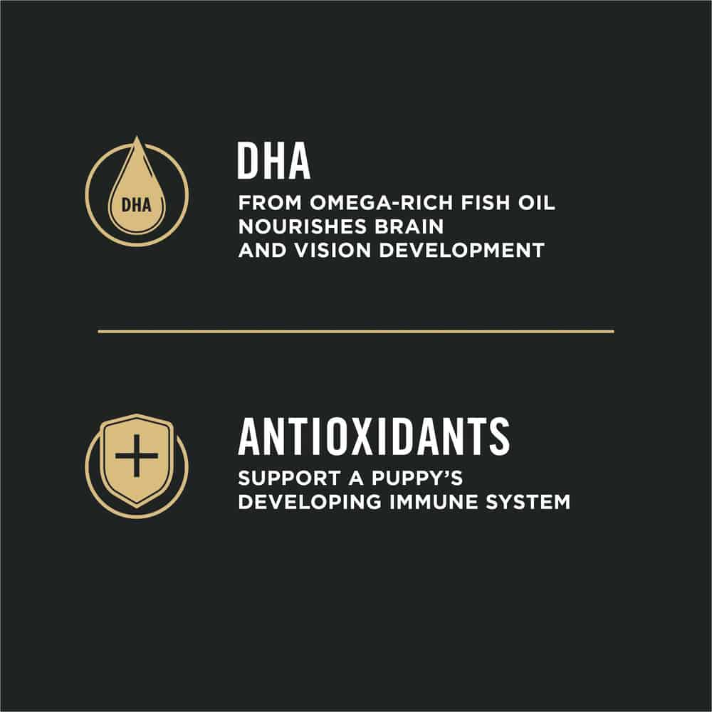 This wholesome dog kibble features salmon as the first ingredient and rice, which is gentle on sensitive stomachs. Purina uses sunflower oil, a rich source of omega-6 fatty acids, and vitamin A to support your puppy's healthy skin and coat. DHA, from omega-rich fish oil, nourishes brain and vision development. Antioxidants in this puppy food support your puppy's developing immune system, while calcium, phosphorus and other minerals help build strong bones and teeth. They fortify this Purina Pro Plan sensitive skin and stomach formula with guaranteed live probiotics to support digestive and immune health and include natural prebiotic fiber to nourish specific intestinal bacteria for digestive health.
