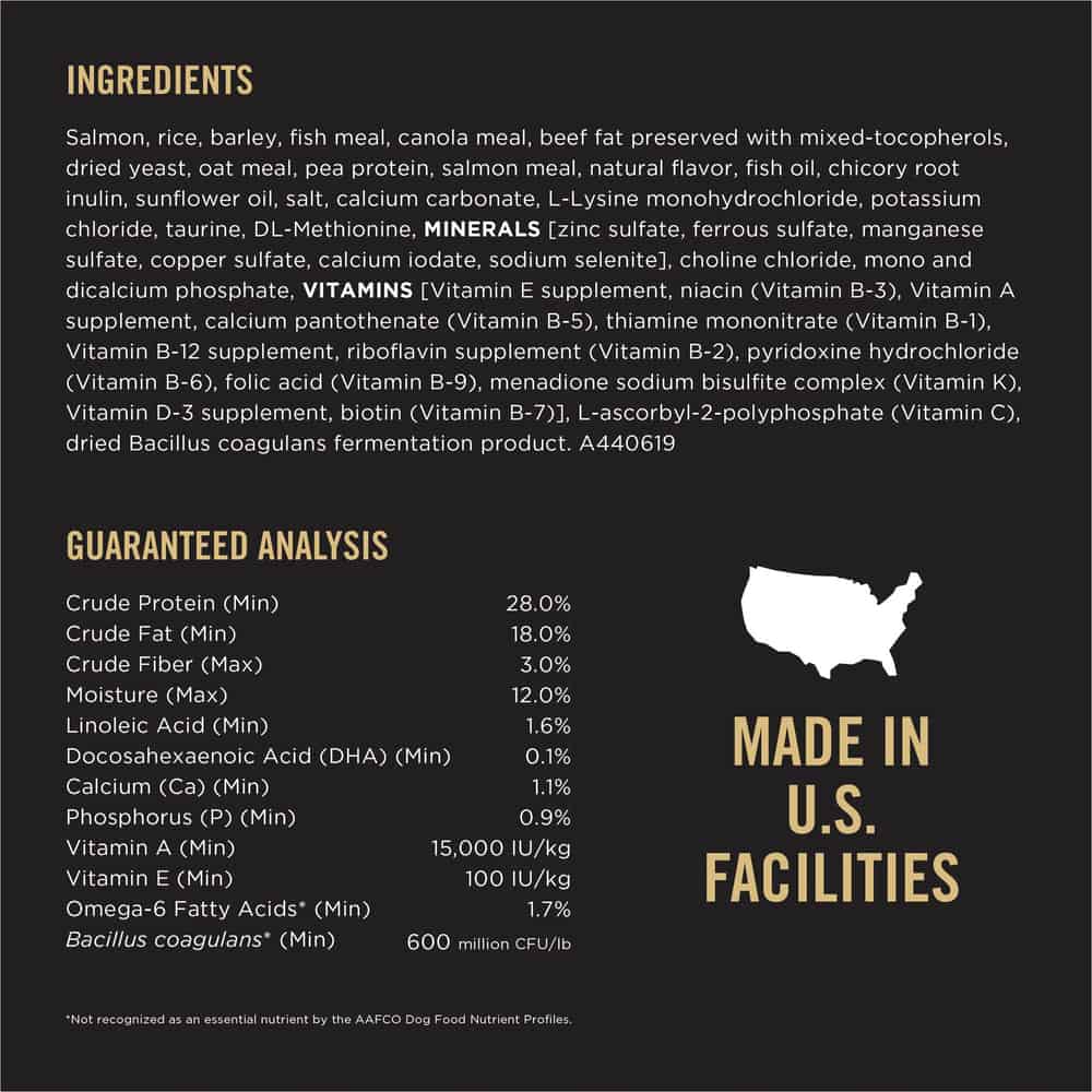 | Salmon, Rice, Barley, Fish Meal, Canola Meal, Beef Fat Preserved With Mixed-Tocopherols, Dried Yeast, Oat Meal, Pea Protein, Salmon Meal, Natural Flavor, Fish Oil, Chicory Root Inulin, Sunflower Oil, Salt, Calcium Carbonate, L-Lysine Monohydrochloride, Potassium Chloride, Taurine, DL-Methionine, MINERALS [Zinc Sulfate, Ferrous Sulfate, Manganese Sulfate, Copper Sulfate, Calcium Iodate, Sodium Selenite], Choline Chloride, Mono And Dicalcium Phosphate, VITAMINS [Vitamin E Supplement, Niacin (Vitamin B-3), Vitamin A Supplement, Calcium Pantothenate (Vitamin B-5), Thiamine Mononitrate (Vitamin B-1), Vitamin B-12 Supplement, Riboflavin Supplement (Vitamin B-2), Pyridoxine Hydrochloride (Vitamin B-6), Folic Acid (Vitamin B-9), Menadione Sodium Bisulfite Complex (Vitamin K), Vitamin D-3 Supplement, Biotin (Vitamin B-7)], L-Ascorbyl-2-Polyphosphate (Vitamin C), Dried Bacillus Coagulans Fermentation Product. A440619 |